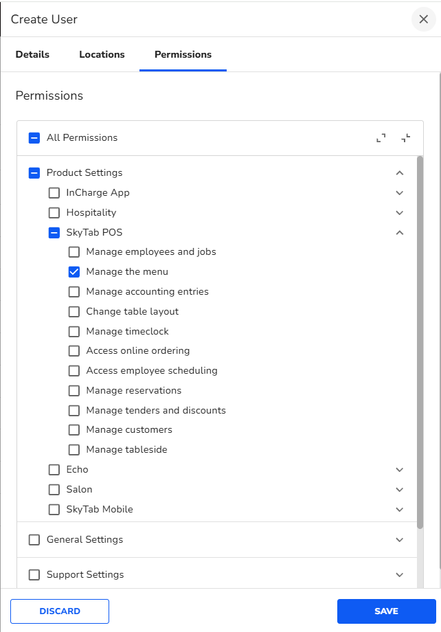 - Expand the Product Settings dropdown, then expand SkyTab POS.