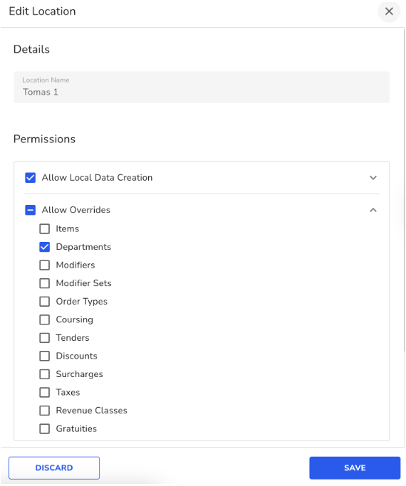 - Select the location to open its permissions and enable the specific menu overrides you want (Items, Departments, Modifiers, etc.).