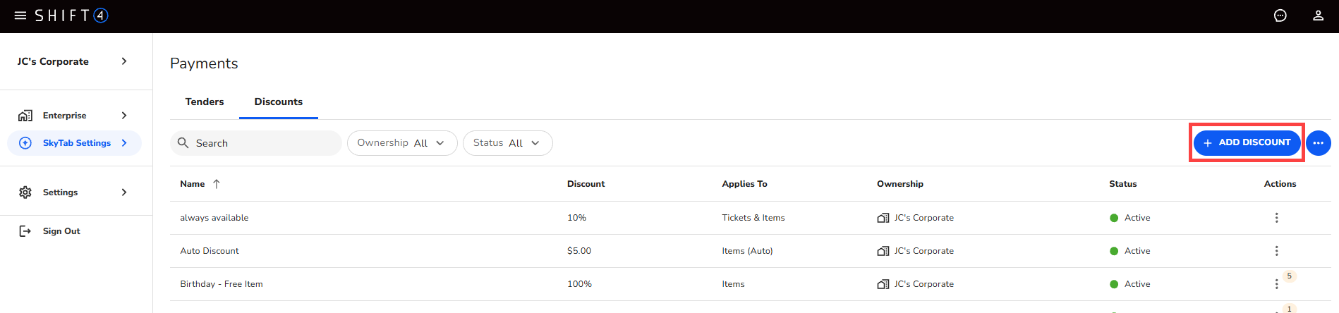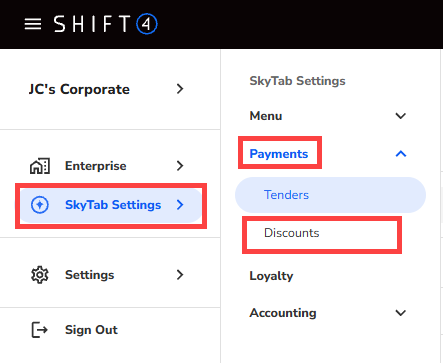 - Navigate to SkyTab Settings > Payments > Discounts.