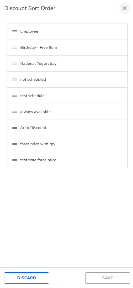 Users can sort discounts in any order they prefer. Changes are applied immediately in SkyTab Multi-Location Management and will appear in SkyTab POS after publishing.