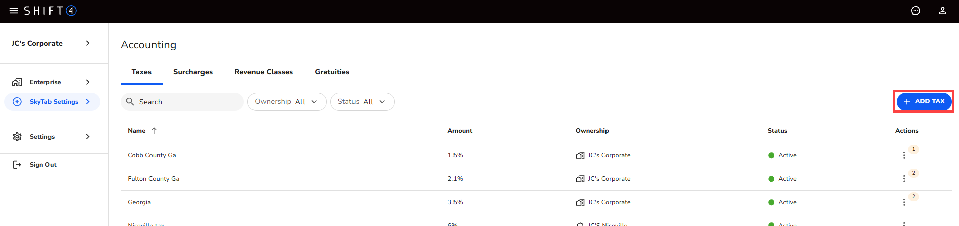- Navigate to SkyTab Settings > Accounting > Taxes.