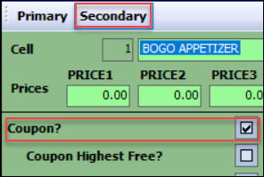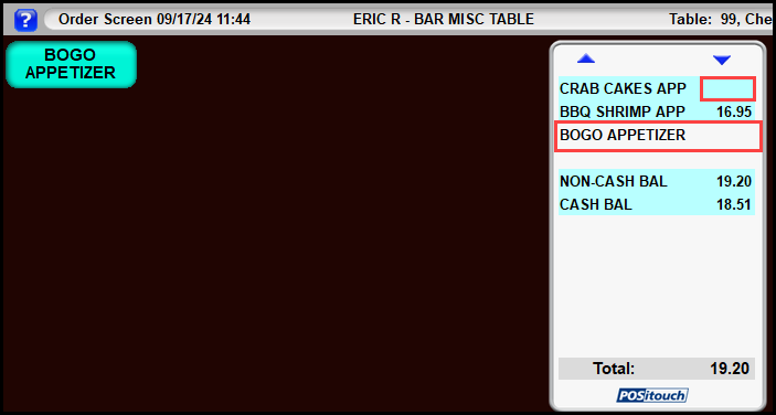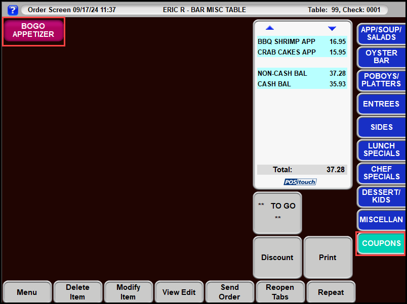 - Reopen the check and navigate to the coupons screen where the BOGO Appetizer coupon is located. Select BOGO APPETIZER.