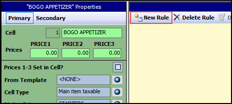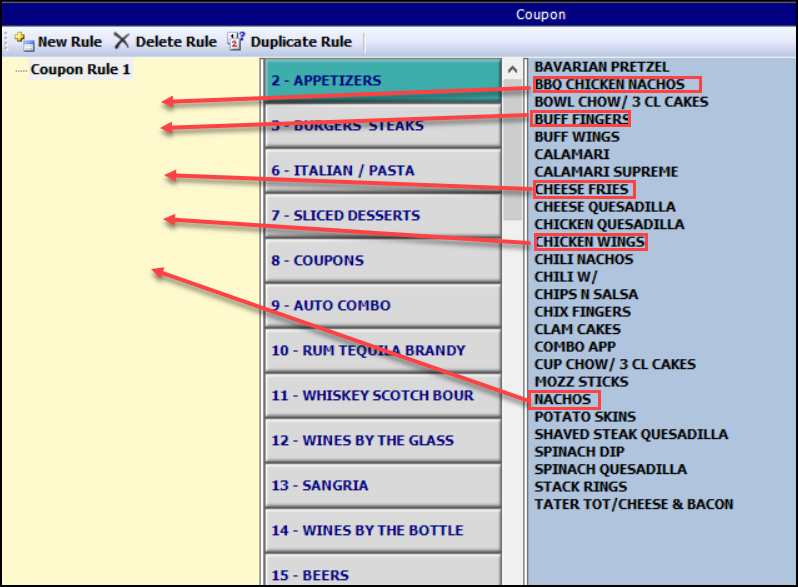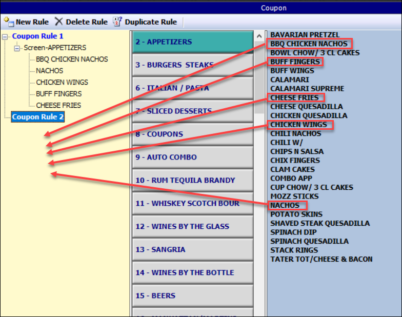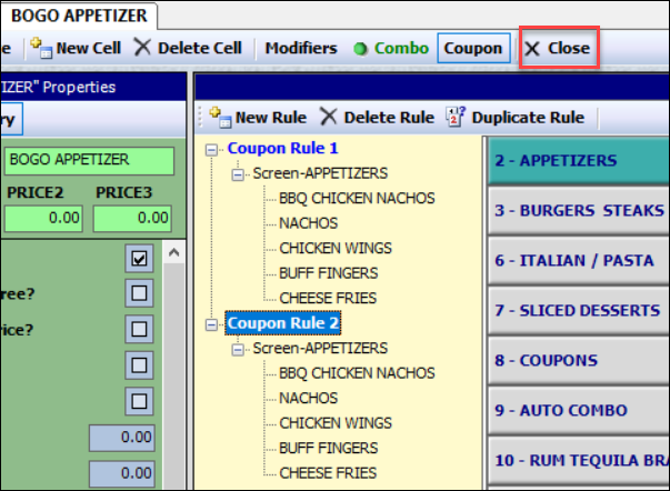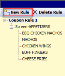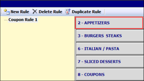 A new line will appear that says Coupon Rule 1. - Select the screen where the menu items that are eligible for the BOGO APPETIZER can be found. (This example will be a BOGO appetizer coupon in which one appetizer is ordered and the second one is free.)