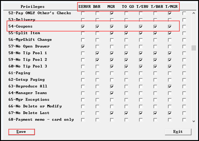 - Scroll down to 54-Coupons and enable the setting for the user types that can apply coupons. Select Save when complete.