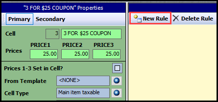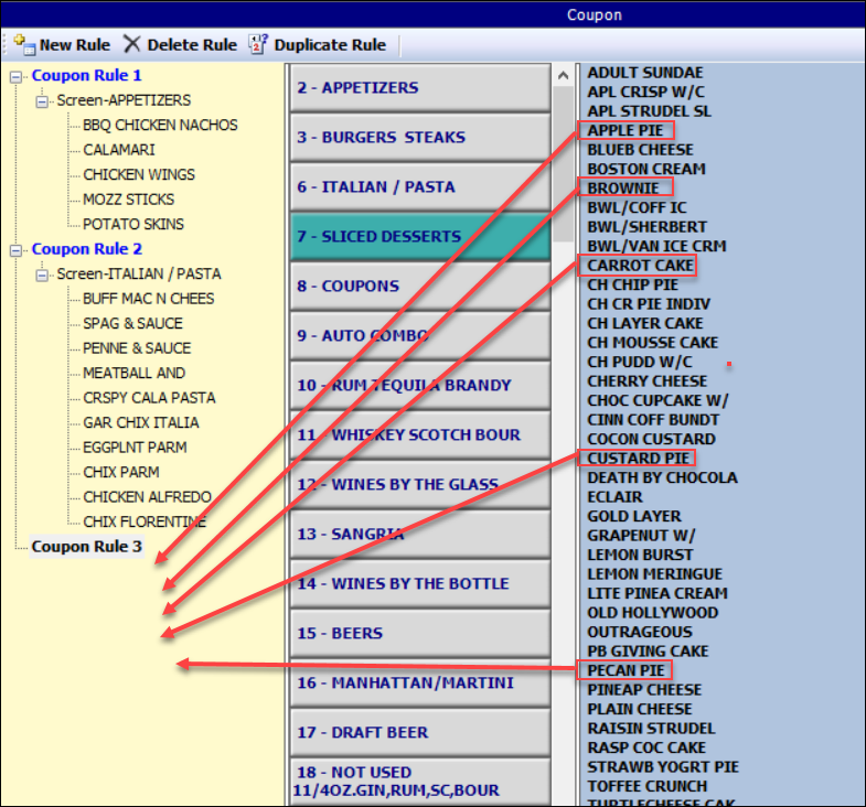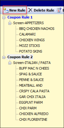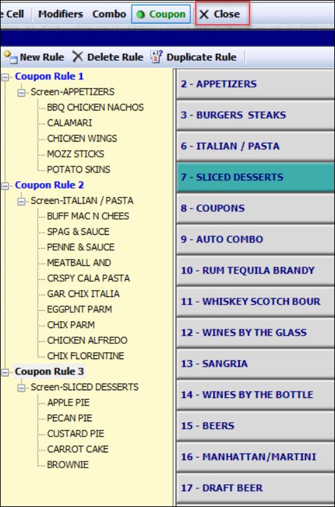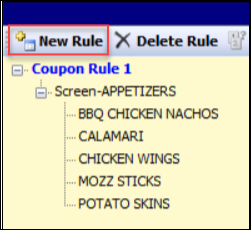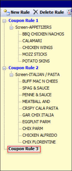 A new line will appear that says Coupon Rule 1. - Select the screen where the menu items that are eligible for the 3 for $25 can be found. (This example will be a 3 for $25 coupon in which the customer can get an appetizer, an entree, and a dessert for $25.)