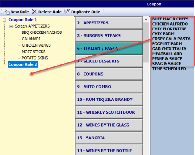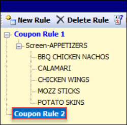 Note: A new line will appear that reads Coupon Rule 2. - Select the screen where the eligible menu items exist and drag the menu items under Coupon Rule 2.