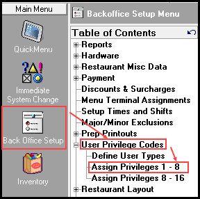 - In Positouch, navigate to Back Office Setup > User Privilege Codes > Assign Privileges 1-8.