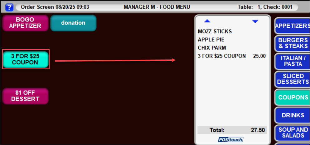 Description: Learn the steps to configure a buy 3 items for $25 coupon in POSitouch.