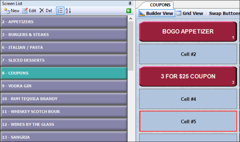 - Select the desired screen for the coupon to reside. (In this example, the coupon will reside on a screen labeled COUPONS.)