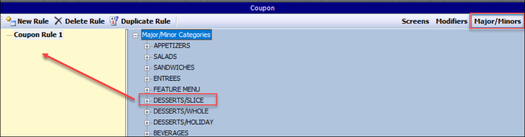 A new line will appear that says Coupon Rule 1. - Select Majors/Minors. Then, select the Desserts/Slice category that is the eligible Major/Minor group for the $1 off Dessert Coupon, and drag it under Coupon Rule 1.