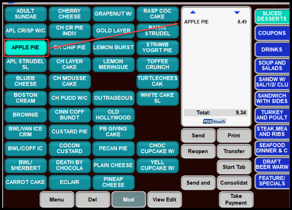 - Ring in an item that satisfies the coupon. (In this example, an item with the major category of DESSERTS/SLICE must be ordered.)