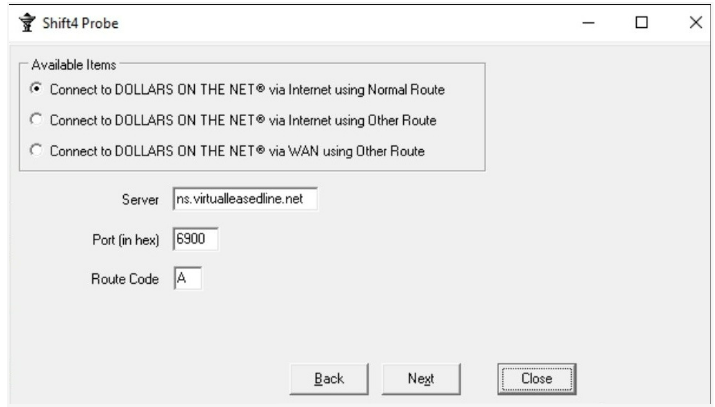 - Under Available Items, select Connect DOLLARS ON THE NET via the Internet using Normal Route. The remaining fields will populate once this is selected. Press Next to continue.