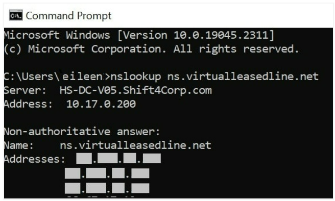 - At the command prompt, have the caller enter "nslookup" without quotation marks. The list of IP addresses returned will be the available servers the UTG will connect to, and there should be twenty in total. If fewer servers are listed, or if none are returned, the merchant will need to have their IT review the Shift4 IP Addresses and DNS Names document to ensure the necessary allowances are made.