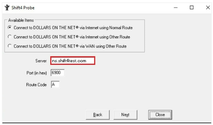 If running the Probe for a Certify or test account, it will need to point to the Certify servers to test properly. Under the box for the server, the URL should be changed to ns.shift4test.com. The rest of the fields will remain the same.