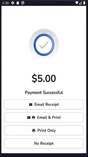 - You will receive confirmation once the payment has been successfully processed, and you can select how the customer would like their receipt.