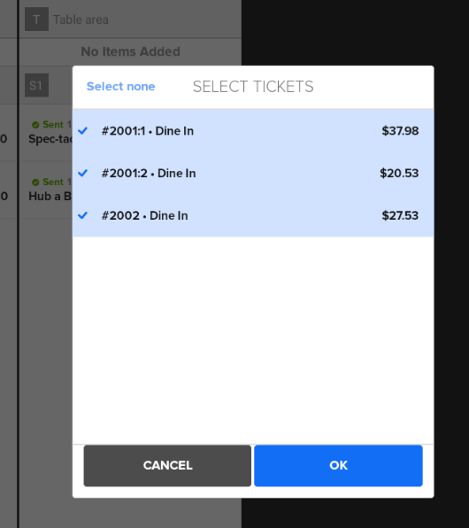 Note: This button is disabled if the preconditions for splitting an item have not been met, as listed above. - Select the tickets to which you want to add the item portion by either pressing the Select all button or tapping on each ticket in the list.
