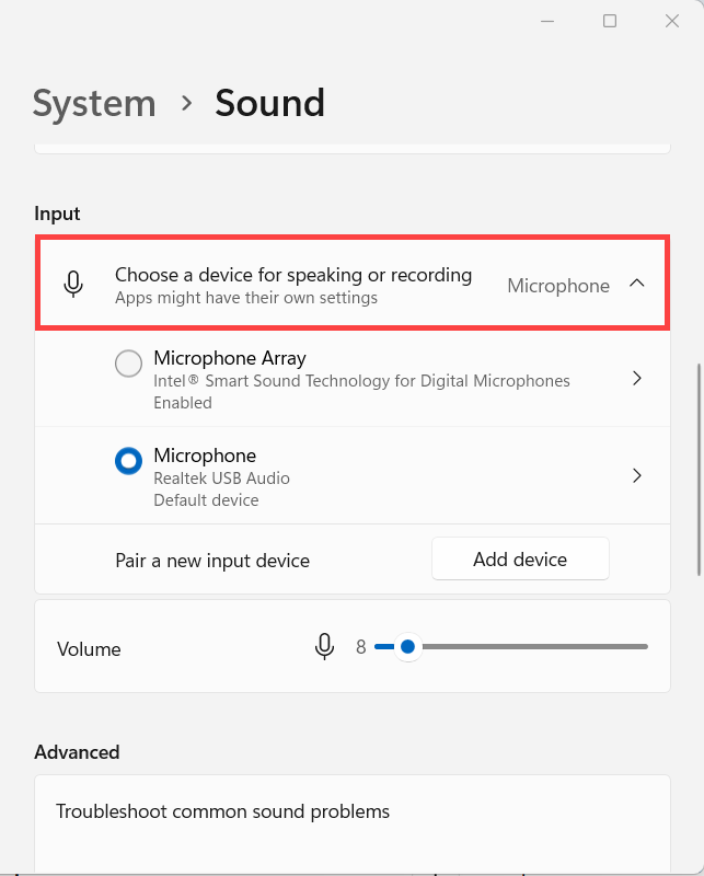 - Confirm the correct microphone is selected under Settings > System > Sound > Input.