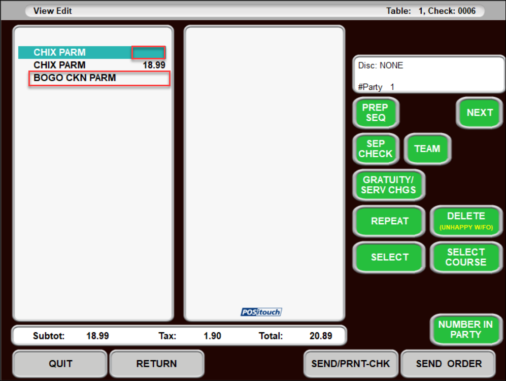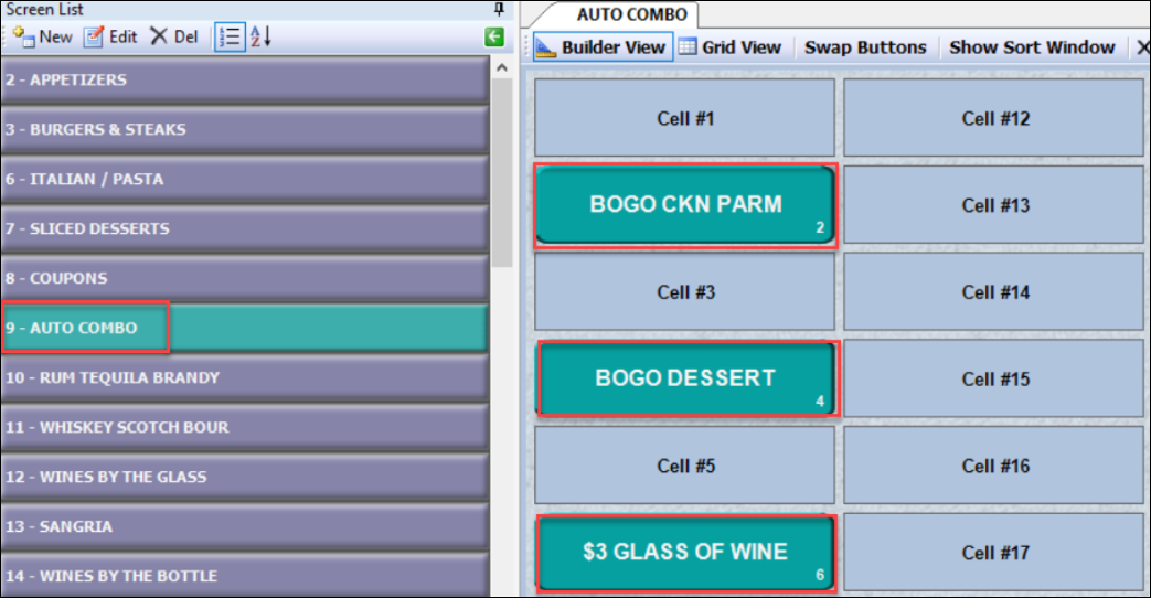 Note: Multiple screens must be consecutive. - Eligible coupons on the auto combo screen (#9 in this example) will apply without user input. For example, when 2 Chicken Parmesan’s (cell name: Chix Parm) are ordered, the BOGO CKN PARM coupon will automatically apply without user input.