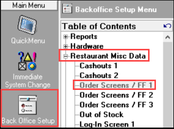 - In POSitouch Back Office, navigate to Back Office Setup > Restaurant Misc Data > Order Screens / FF1.
