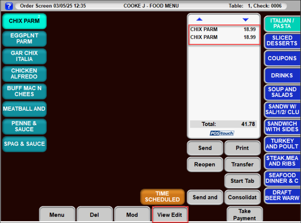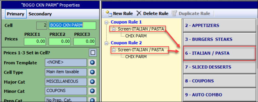 - Ensure that the required items that need to be ordered are listed in the coupon rules. In this example, the item ordered must be the Chix Parm that is located on the Italian / Pasta screen. If there is an additional Chix Parm on a different screen, it will not be eligible for this specific coupon.