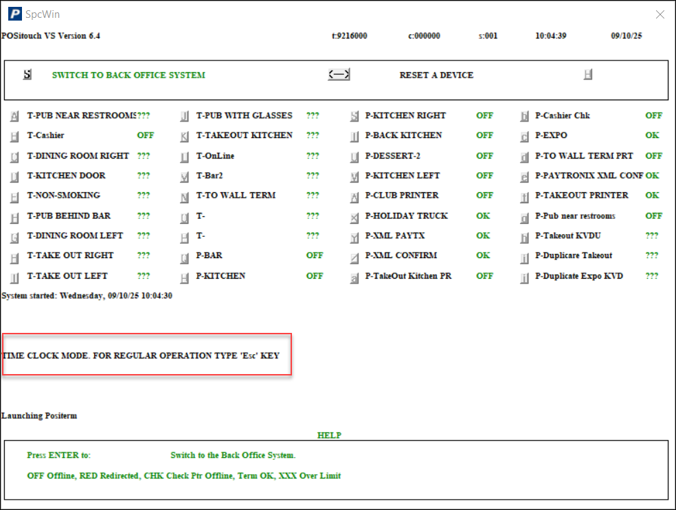 Optionally, removing the file Timeclk.$$$ from the SC directory on the POS driver and performing an immediate system change will also bring the system up in regular operation and out of Time Clock Only mode.