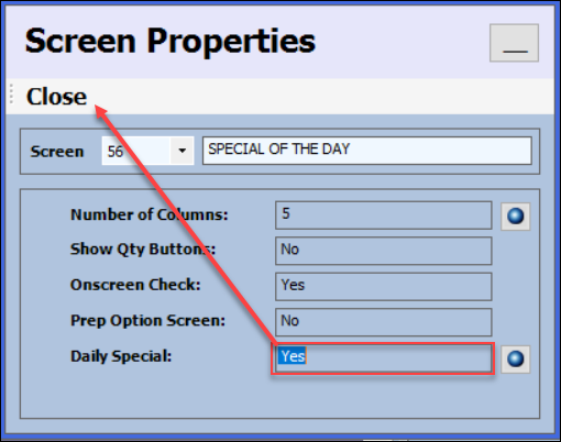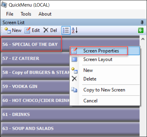 - Open QuickMenu, right-click on the screen to become the Daily Special screen, and select Screen Properties.