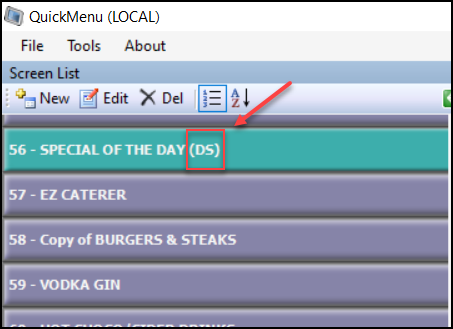 - The screen will now include (DS) at the end, indicating that it is a Daily Special screen.