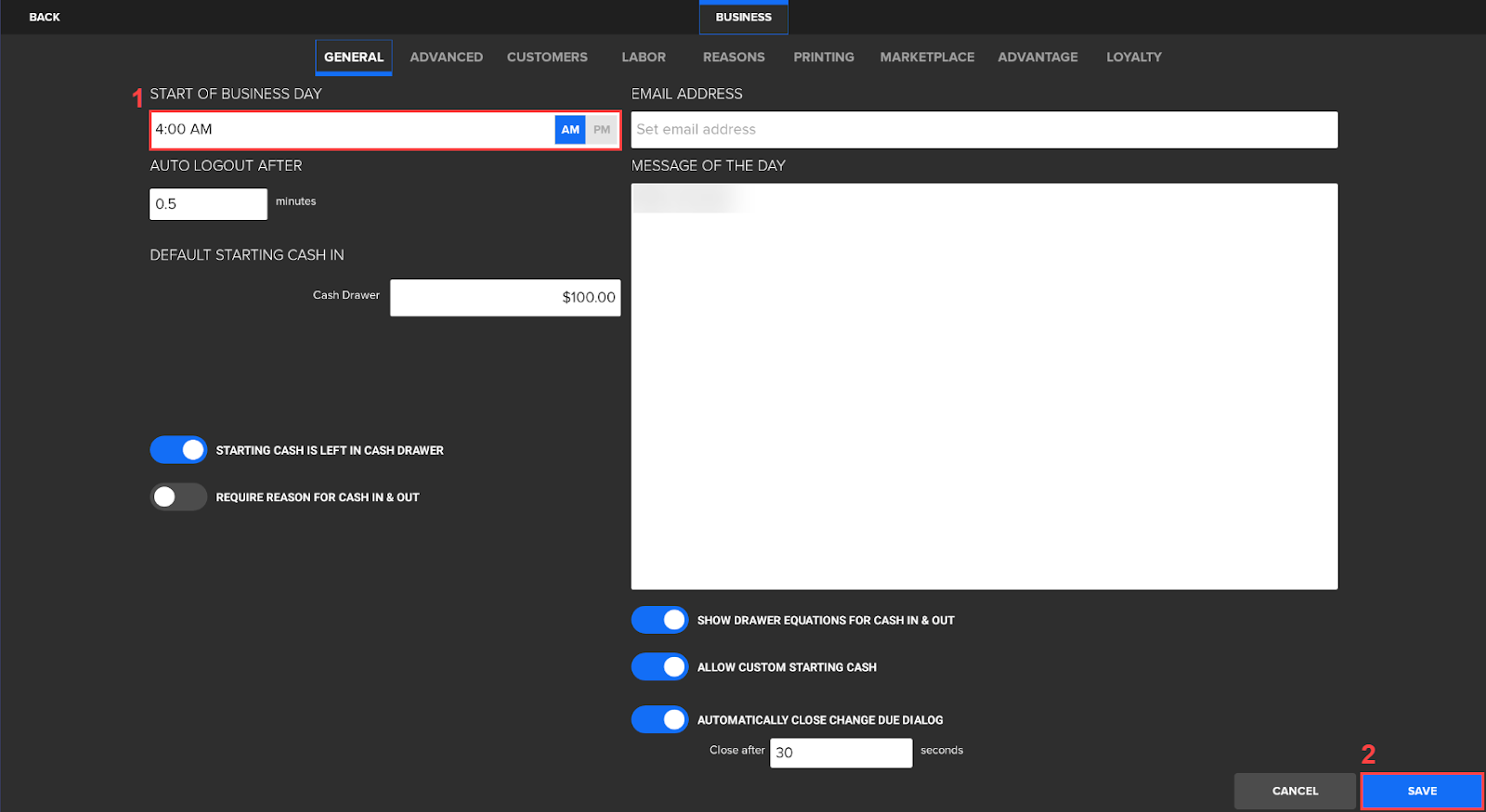 - Navigate to the Manager > Settings > Business > General and find the Start of Business Day section.