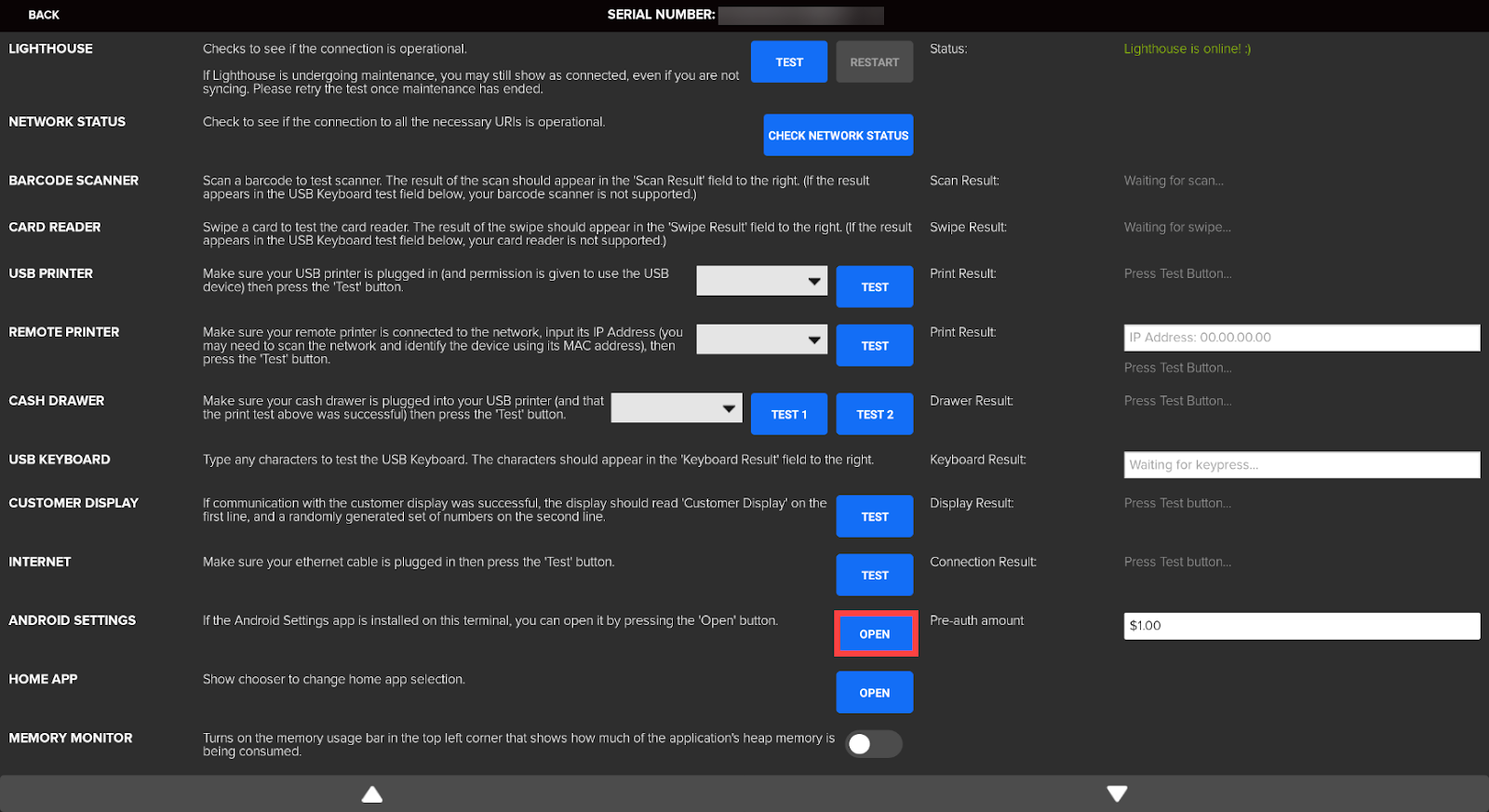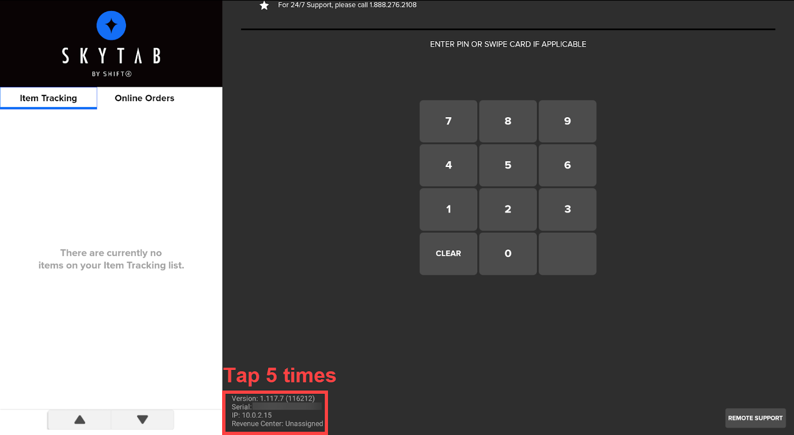 - On the SkyTab POS Login screen, tap 5 times repeatedly on the device serial number to open the secret menu as shown in the screenshot below.