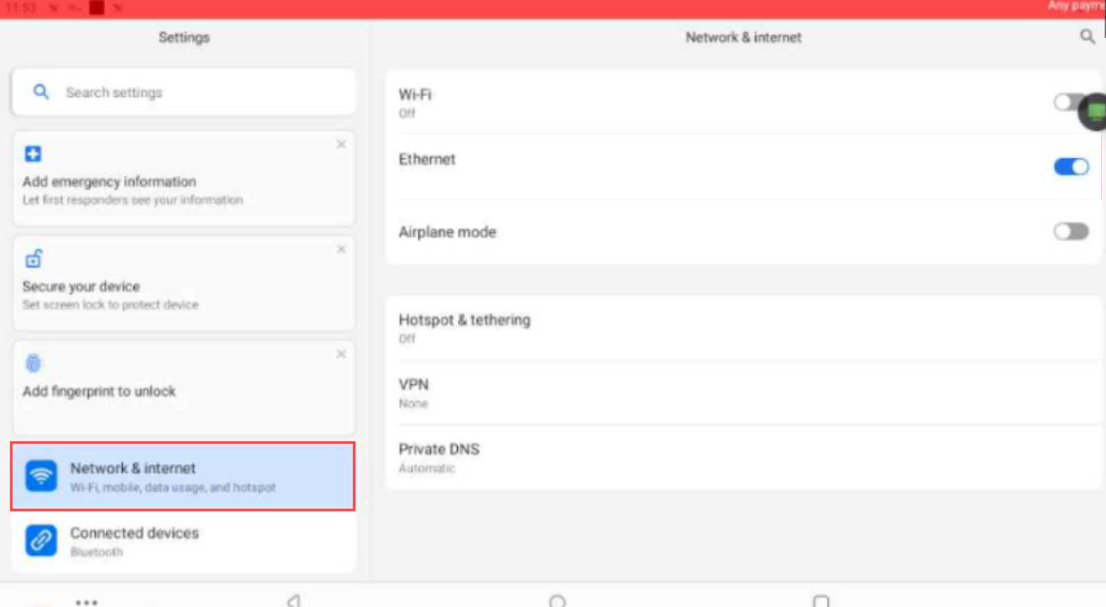 - In Android Settings, select the Network & Internet section from the left side menu.