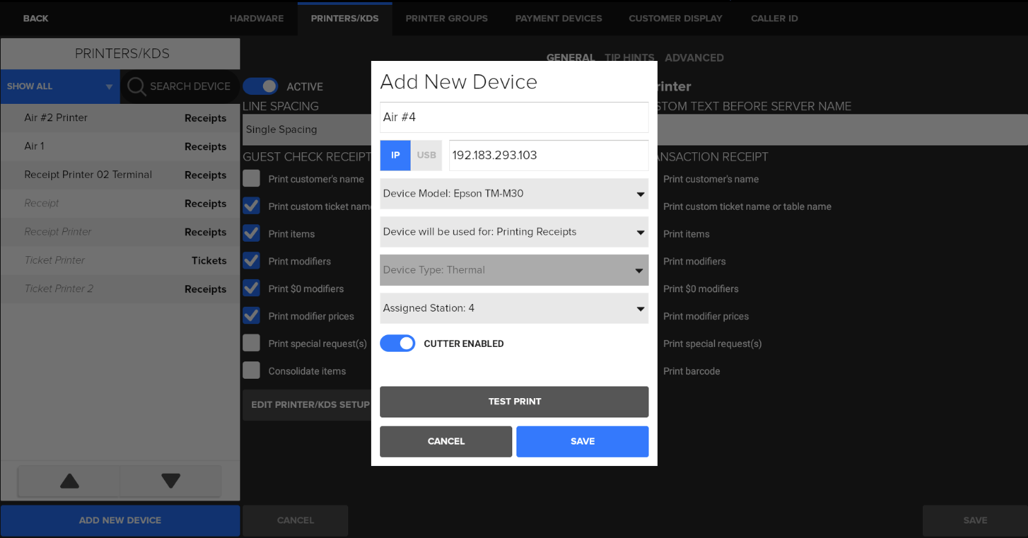 - On a workstation POS (fixed terminal), navigate to Manager > Settings > Hardware > Printers/KDS > Add New Device.