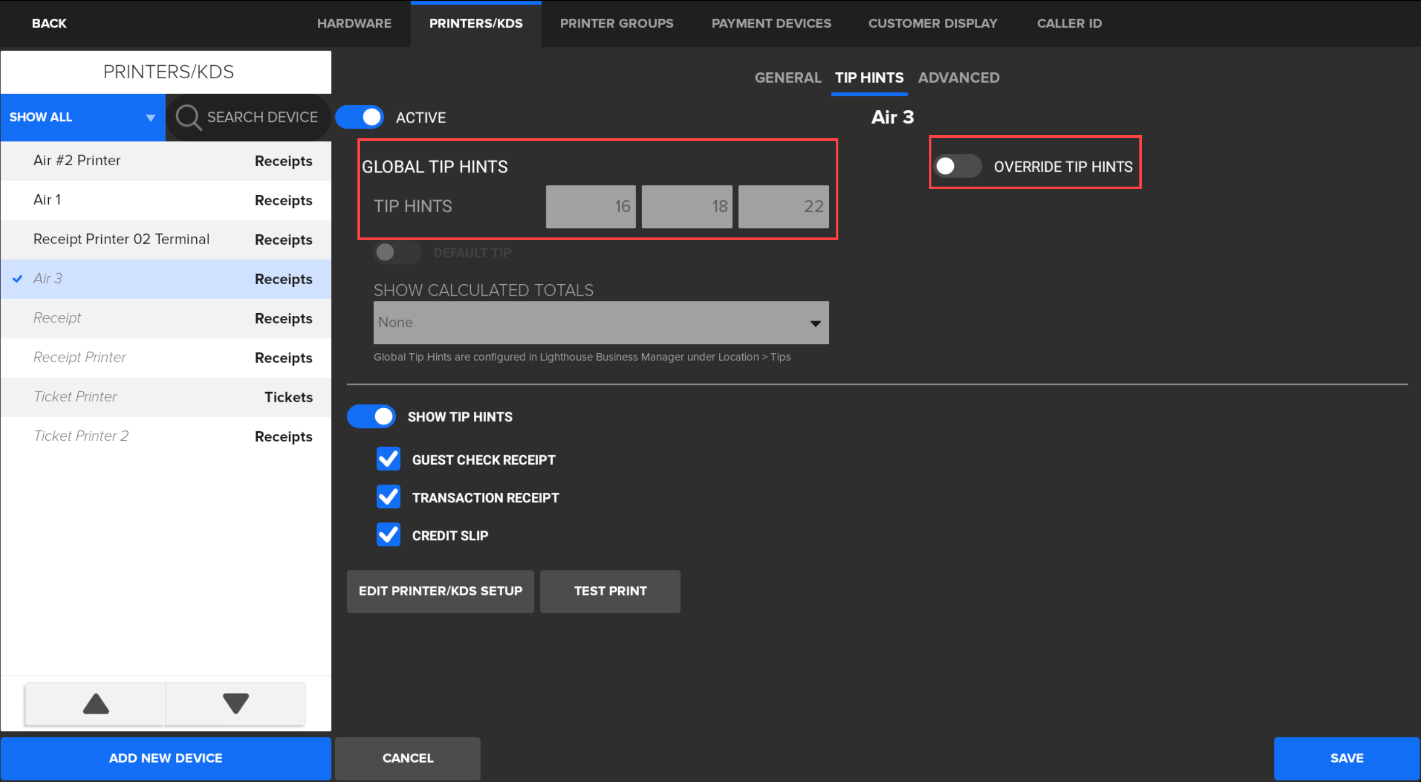 This allows employees to adjust printing on a per-shift or per-check basis without affecting the main Air printer setup.