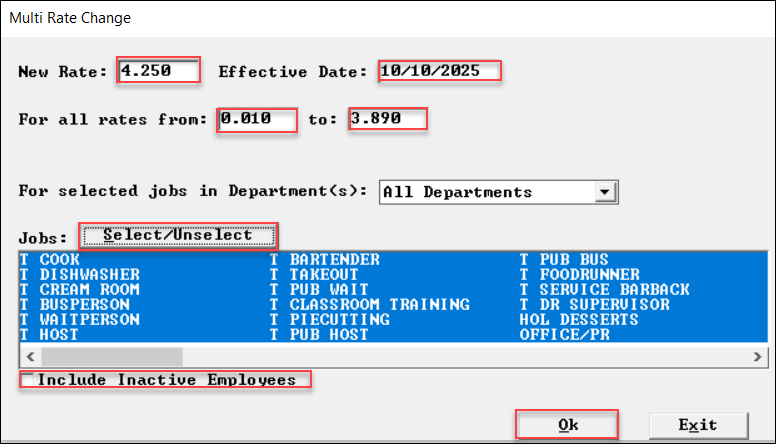 - The new rate of $4.25 will be applied starting on 10/10/25 to all rates ranging from $0.01 to $3.89 across all departments (use Select/Unselect to highlight all departments in the list). Including the $0.01 starting rate ensures that jobs intentionally set at $0.00 will not be affected, for example, salaried employees.