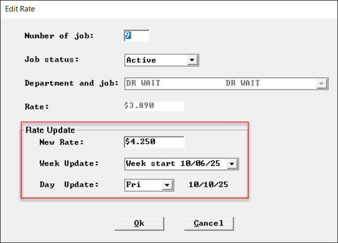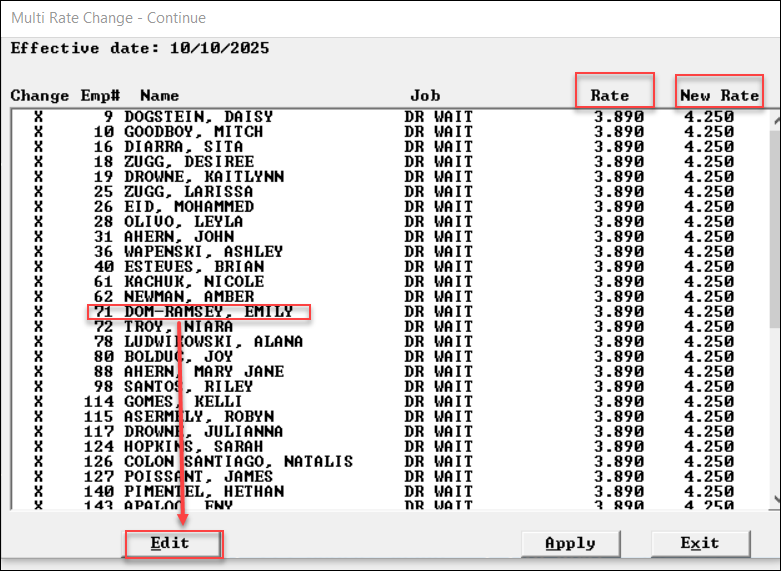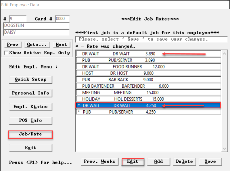 The job “DR WAIT” has a current rate of $3.89 and listed below the “DR WAIT” job marked with an asterisk (*), has the new rate of $4.25. - Select Edit to view the date and day of the week that the change will become active.