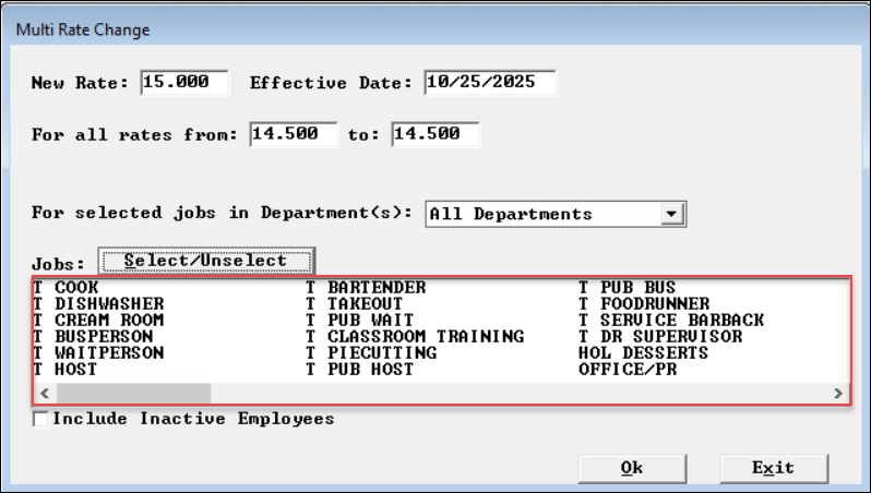 This example shows all jobs except for “T COOK” and “T PUB WAIT” are selected. Selecting Select/Unselect will select all jobs or unselect all jobs listed.