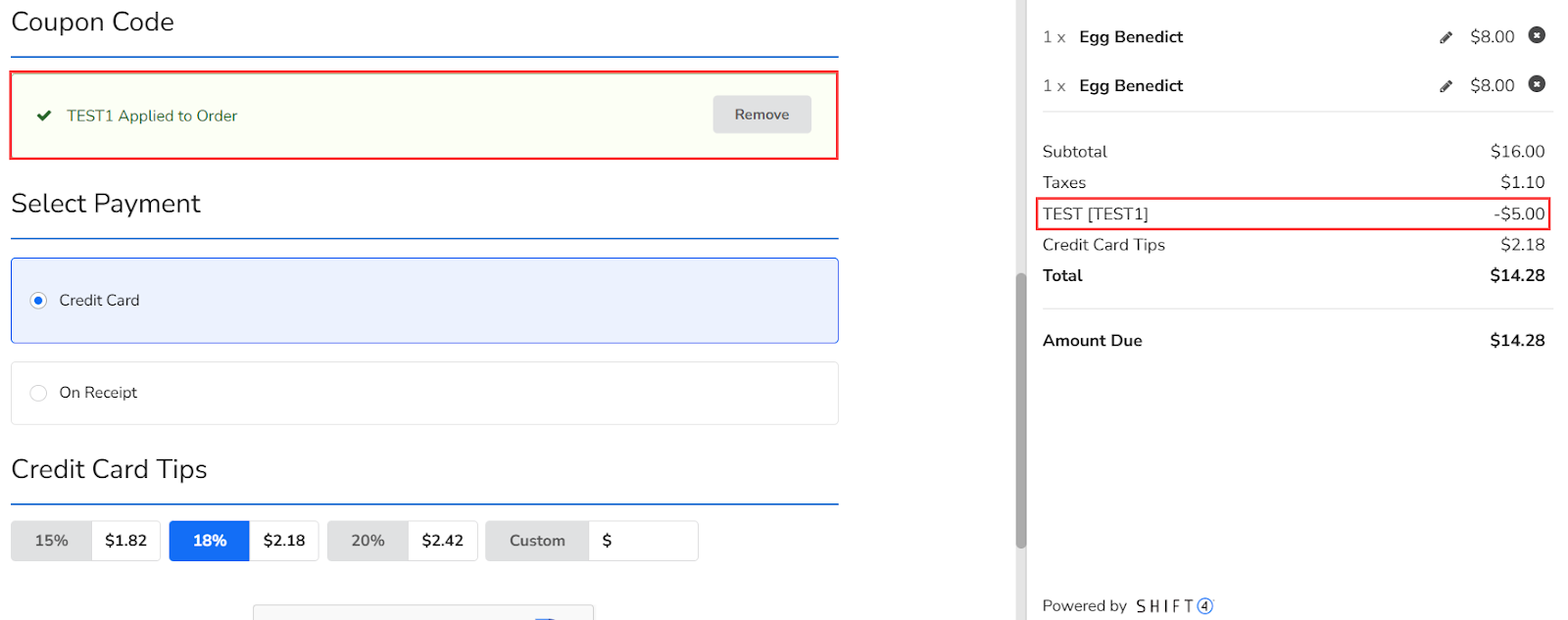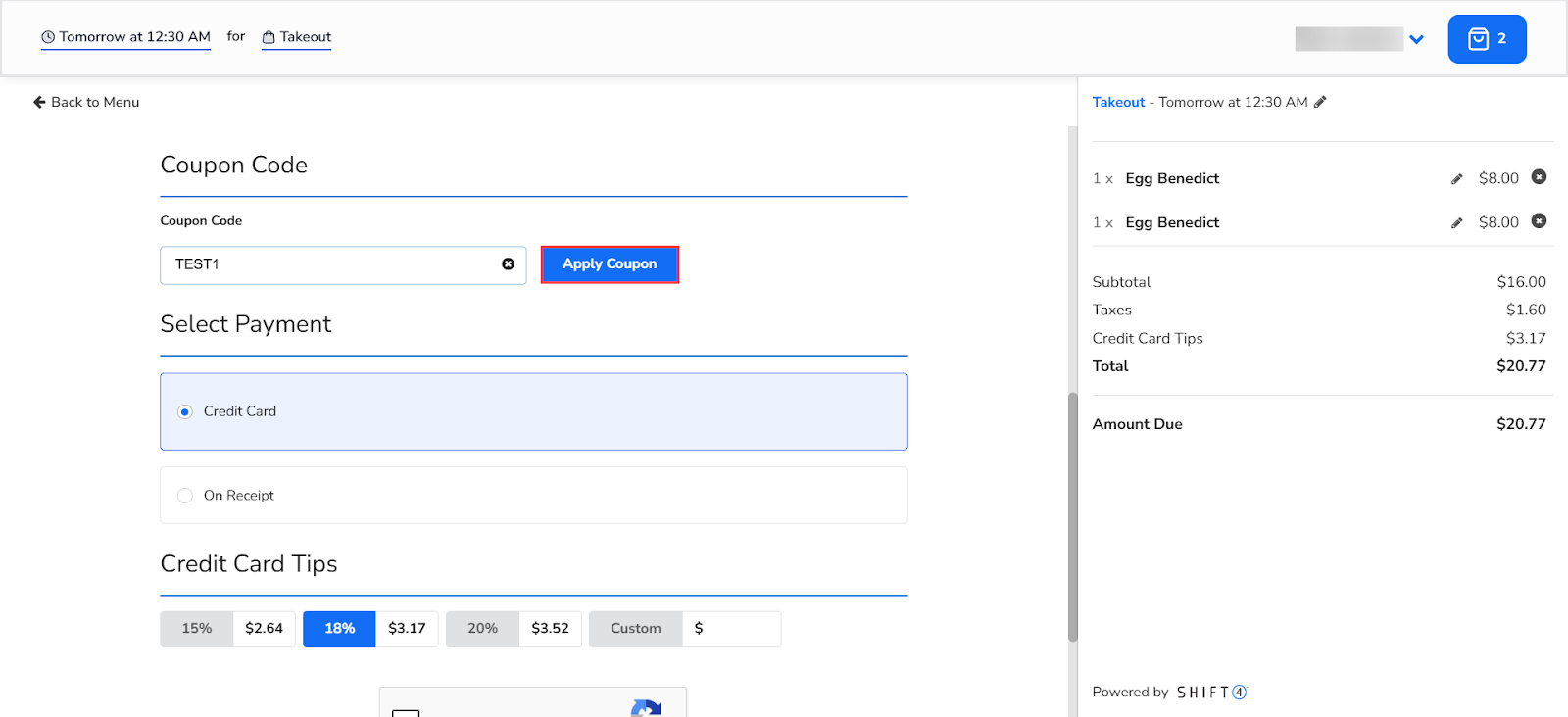 - Navigate to the SkyTab Online or QR Pay ordering website, create a test online order, enter the coupon, and press the blue Apply Coupon button.