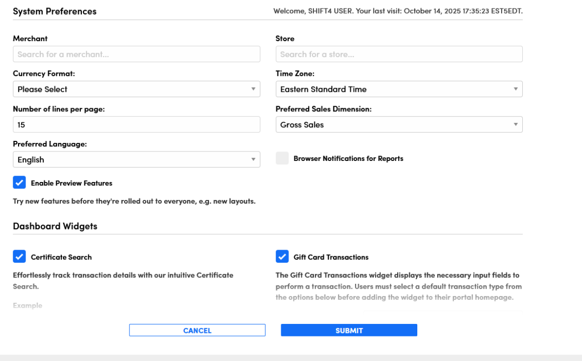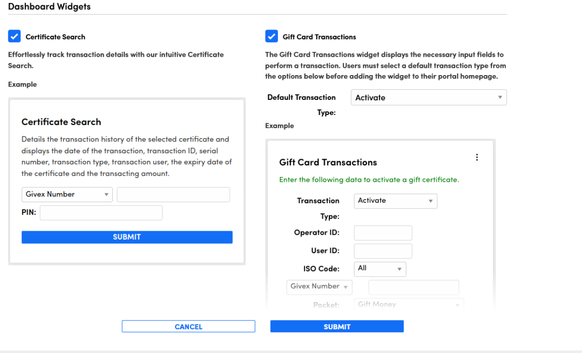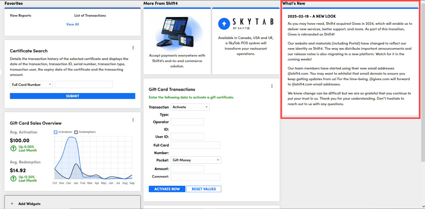 Widgets are the tiles on the right side of the dashboard, offering a glance at your performance (sales/performance widgets) and easy access to key functions like card search and transactions. To add or remove a widget, go to System Preferences.