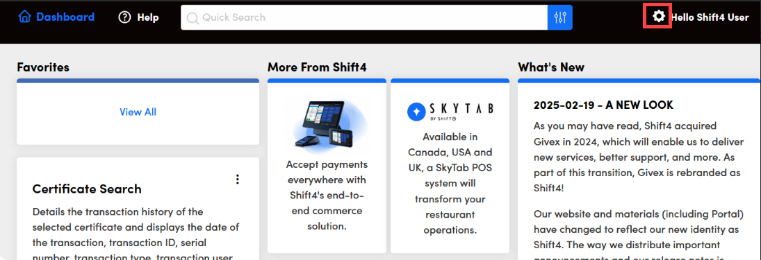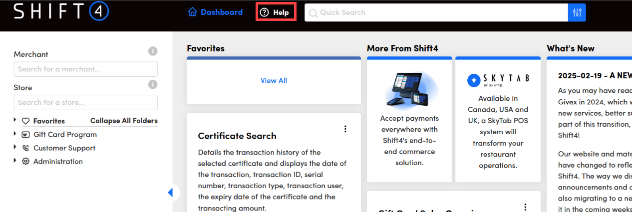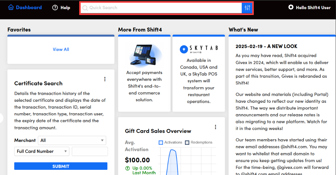 Description: The home page provides a dashboard with key tools, including Widgets, Favorites, Help, Quick Search, and System Preferences, plus the What's New section for updates.