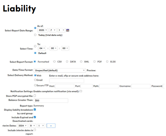 The Liability Report shows the total value of gift cards that are still outstanding at a specific point in time. In other words, it reflects how much money is currently tied up in active or valid gift cards that have not yet been fully redeemed.