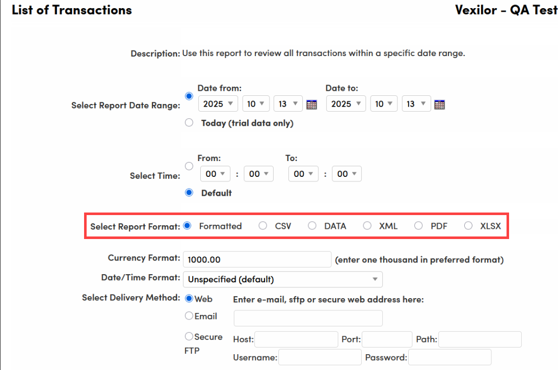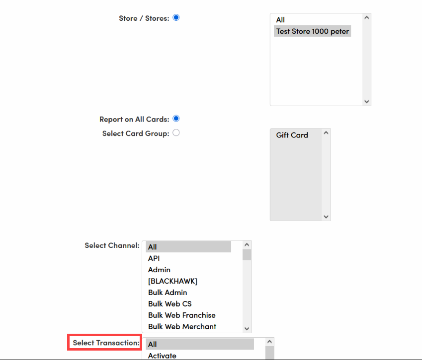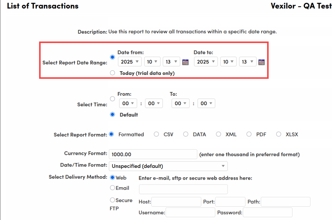 Select Date Range: Use the Report Date Range to search for transactions over a specific period.