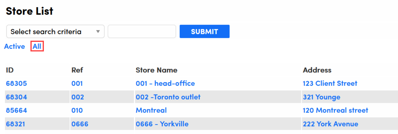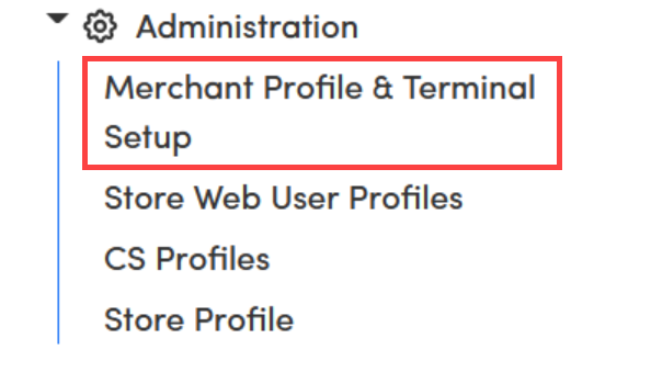 - Navigate to Administration > Merchant Profile & Terminal Setup. A Store List will appear for the merchant.