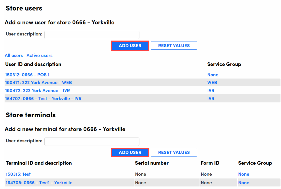 - Add User: Use this option under Store Users or Store Terminals to create new IDs. Only CS Users with proper permissions can complete this action.