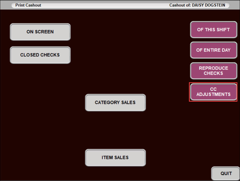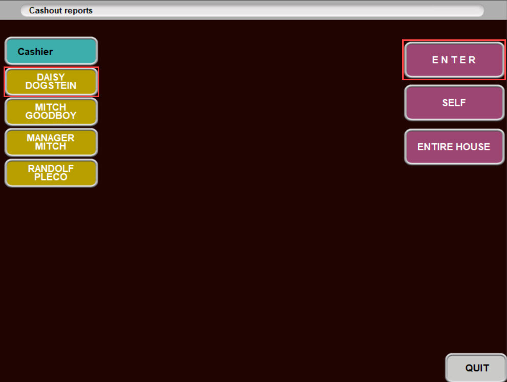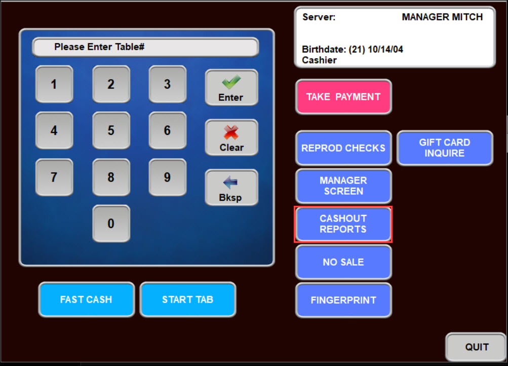 - Swipe the manager's card to proceed. Alternatively, a fingerprint scan or the manager’s number and password may be used. Then, select Cashout Reports.