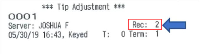 - Upon entering the record number, the initial tip will be displayed. Enter the correct tip amount and select ENTER. A new authorization will now print that will have a new record number, should the tip need to be adjusted again.