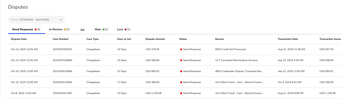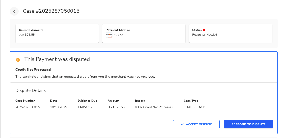 - View Chargeback Details: Review key information such as the original transaction information, chargeback date, amount, and reason code.