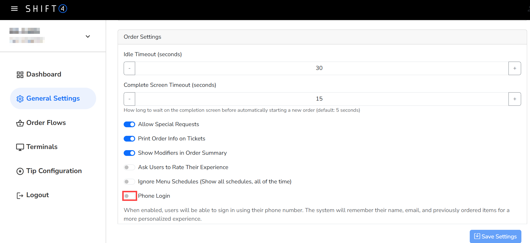 - Scroll down to Order Settings and enable the toggle for Phone Login.