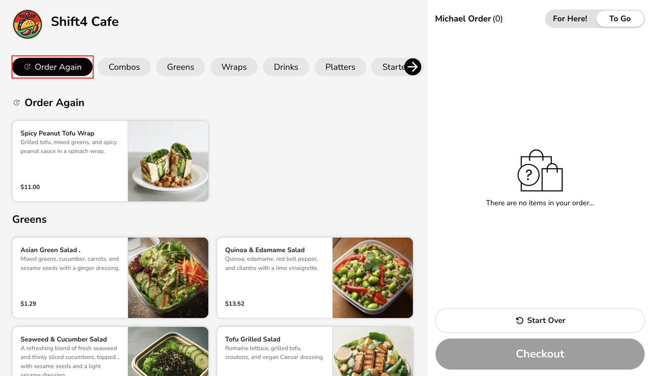 - Past items are displayed on the screen, and guests can reorder them instantly by tapping the Order Again button.