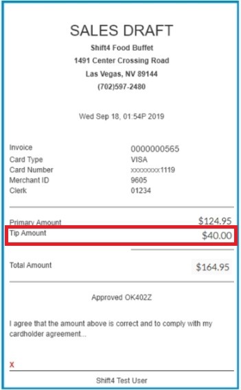 - Type over the incorrect tip amount with the corrected amount. (In this example, the tip was entered as $400.00 and should have been $40.00) After pressing tab, the total amount will reflect the primary amount plus the adjusted tip amount.