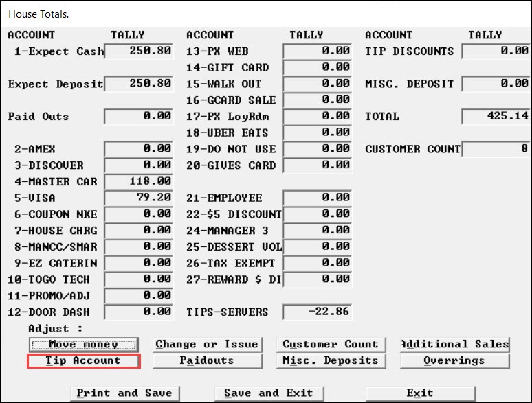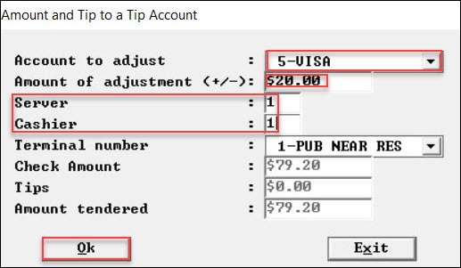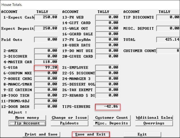 - The VISA amount was increased (as this total now includes the added tip), and TIPS-SERVER amount was also increased by $20. Select Save and Exit.