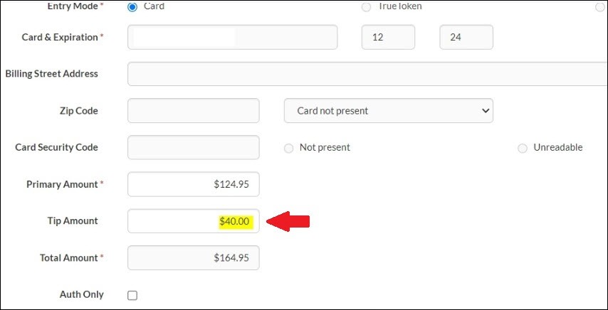 - Enter the tip in the Tip Amount field. The Total Amount will reflect the Primary Amount plus the Tip Amount.
